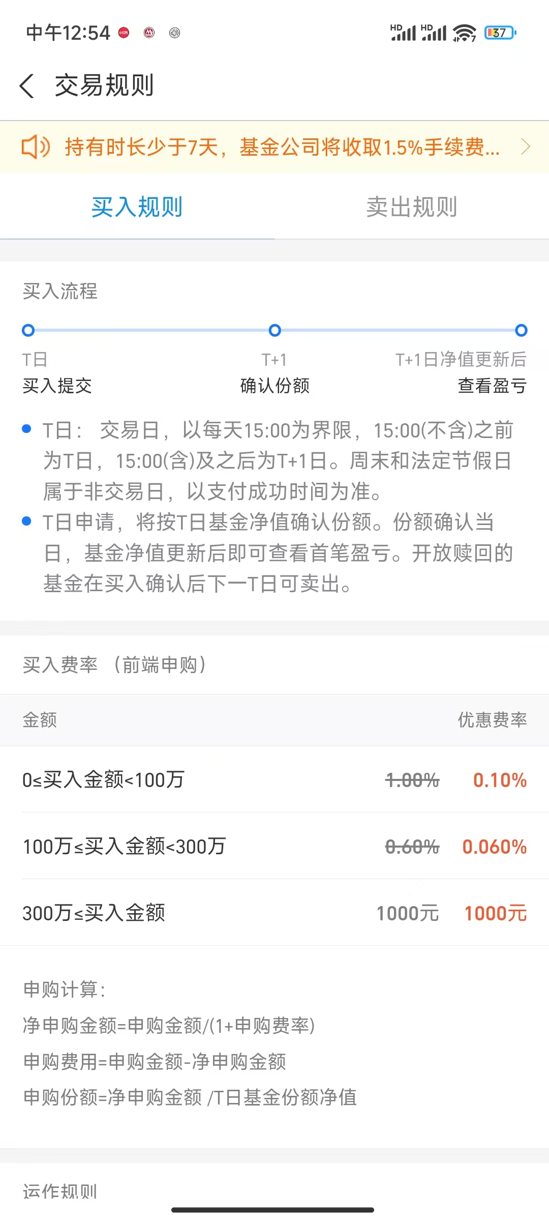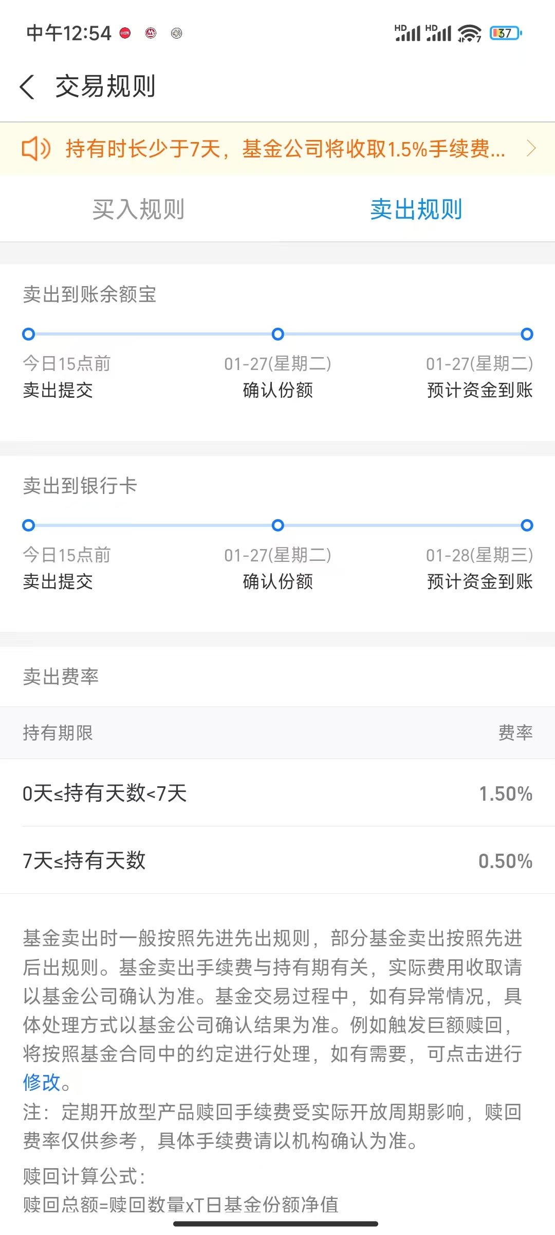 记得查看交易规则,基金的净值确认时间是在 15:00,所以这玩意的交易实际上是第一天交固定金额的钱购买,第二天确认买进了多少份额的基金,第三天可以提交卖出,第四天确认最终卖出了多少份额的基金,第五天钱到账上。